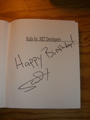 As a first step, I will make a new effort to learn Ruby. Why Ruby? Because the other thing I came home with was a book titled Rails for .NET Developers. Scott told us about a project he’s planning, which involves developing a Rails-based web site, and invited us to contribute. I liked his idea, but had to admit I would be of little use as a developer since I knew no Ruby. That’s no excuse! he said and offered me the book. What the heck, said I, took the book and decided to have a go. So not only have I met a celeb developer up close, I now also own a book that used to belong to a celeb developer, ha ha.