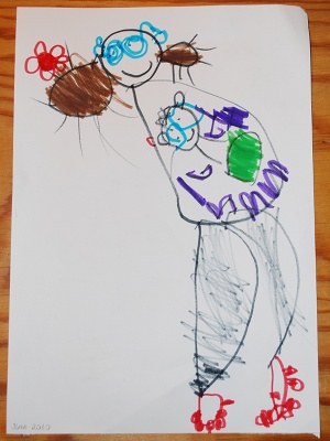 Ingrid still draws a lot. When she draws on her own, it’s mostly people. They are now much more detailed: there is hair, fingers and toes, sometimes fingernails, boobs and navels, ears, necks etc. When she draws me, she will often also draw a baby in my belly, like in the picture above. Not all of the body parts are always present, but I don’t think I’ve seen her draw a single tadpole this month. From blobs to mum-with-fingernails-and-baby in under two months.