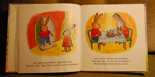 Her first book was En liten stund by Anna-Clara Tidholm. It’s really a book for toddlers: a simple story, about 30 pages, with a picture and a couple of sentences on each page. (It’s about two rabbits who eat pancakes. Lots of pancakes, with lots of raspberry jam and cream.)