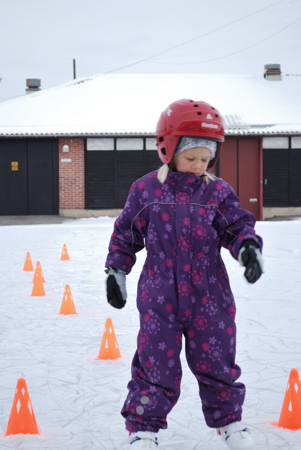 Since the beginning of this term, the kids have been going skating every week at school, and Ingrid’s skating skills have improved enormously. Now she actually glides with (relative) speed and confidence. She can turn, and skate on one leg for short stretches. She has even tried skating backwards a little bit. A month ago we used to chase each other on ice: me skating semi-slowly backwards in front of her, her trying to catch me. The last time we went skating together, I definitely was NOT going to escape her if I skated backwards, and even skating face-forward I had to exert myself to not get caught. On a long straight stretch I can outskate her easily, but when I have to maneuver and turn because we’re about to reach the edge of the rink (and she can turn and intercept me when I am forced to turn) we’re now almost evenly matched.