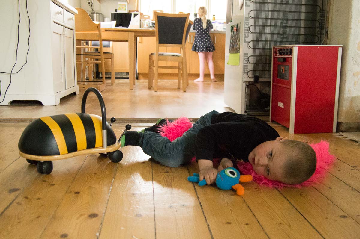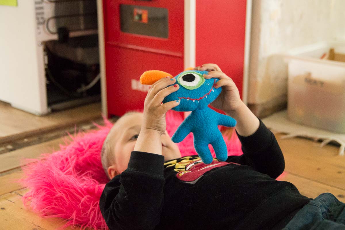 Adrian had Rufus the plush monster. Then Rufus mysteriously disappeared, and Dinah arrived to replace him. But Dinah was never quite the same and Adrian still missed Rufus. So now we made Rufus Junior together. Ingrid embroidered the face, I did the assembly, and Adrian cut and stuffed.