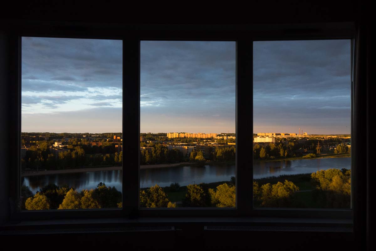 We’re on the 12th floor with a fabulous view of half the city, including the river. Too bad the windows face east (and it’s summer so sunrise is way too early).