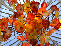 But most of Chihuly’s installations were scattered throughout the greenhouses, which turned out to be an eminently suitable setting for them. One of the advantages of this arrangement was that the installations were unpredictable. In a gallery, you always know that there will be more art around the next corner. Here, art had to be discovered, and often took me by surprise: lilac rods of glass between agaves in the desert; wobbly yellow plates in a carp pond; a mass of huge patterned balls arranged like a string of balloons rising towards the greenhouse roof, and my favourite – a chandelier of red and yellow plates.
