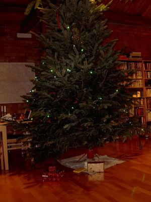 We’ve had some trouble finding the right sort of trees here in London – they mostly sell firs of various sorts, whereas the traditional tree in Estonia and Sweden is a spruce (picea abies). I’ve got to admit that firs generally look lusher and greener; spruces tend to be thinner and sparser. And spruce needles are a lot sharper – although that only matters initially when you’re hanging up the decorations. However, some firs hardly have any smell at all – we happened to buy one of those the year before last (or maybe it was last year). The smell is an important part of a Christmas tree, and this year’s tree smells wonderful.