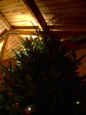 The tree almost manages to look huge even in our apartment, even though the ceiling here is quite high. The crossbeams are at least 3m from the floor, and the ridge is about another 2m above that. The tree must be a good 4 metres high, and large enough that it doesn’t really stand up on its own and rests against one of the beams. I wonder how Eric got it home, or in through the door! (“On the bike,” he says.) Our string of Christmas lights looks almost puny on that tree. (We haven’t got the rest of the decorations up yet.)