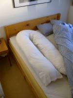 Eric had reminded me a few days earlier that there are long body pillows I could try. I thought I’d simply buy one of these, but when I went to look for one on Ebay, the search brought up some more interesting results as well: huge V- and C-shaped pillows. They were three times as expensive as simple bolster pillows, but, well, they looked so funky that I just had to try one. I bought one straight away – anything to get a good night’s sleep! – and it was delivered two days later, just in time before Eric was to come home. There were some big eyes in the office when my parcel arrived!