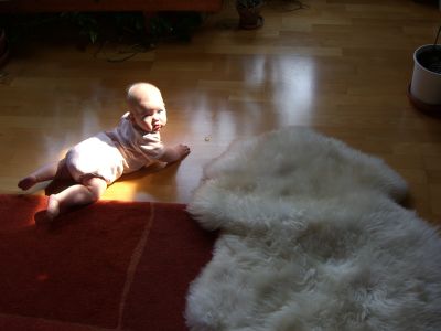 And while she is on her tummy, she now wants to go places and do things. She wants to reach that toy, or that corner of the carpet just ahead of her, so she strains with her whole body… and pushes herself backwards. Frustration ensues. Or she pushes more with one arm and rotates in place like the hands of a clock. (When I took the photo she started out on her back on the fleece, with her head roughly in the middle, where the wool has been flattened.)