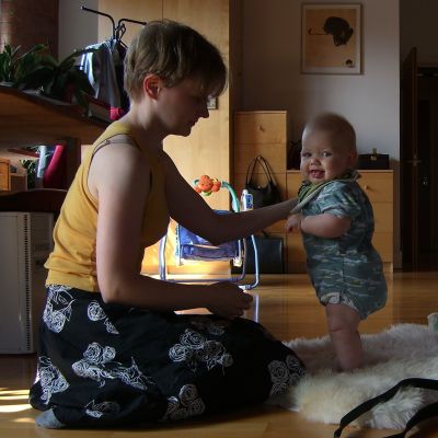 She has also rediscovered her ability to make sounds. She was making simple vowel sounds (aah and ääh) several months ago but then stopped and went quiet. Now she’s clearly trying out a new range of sounds again. Da-da-da is a common one, as is hä-hä-hä. The former could easily be interpreted as the beginnings of “daddy”, if it wasn’t for the fact that she says it in all sorts of situations that don’t involve daddy, so it’s really just vocal gymnastics.