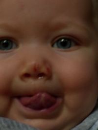 The inevitable happened… Ingrid learned to crawl out of her cot onto our bed (over the pillows and rolled-up blankets blocking her way) and from there onto the floor. Landing nose first.