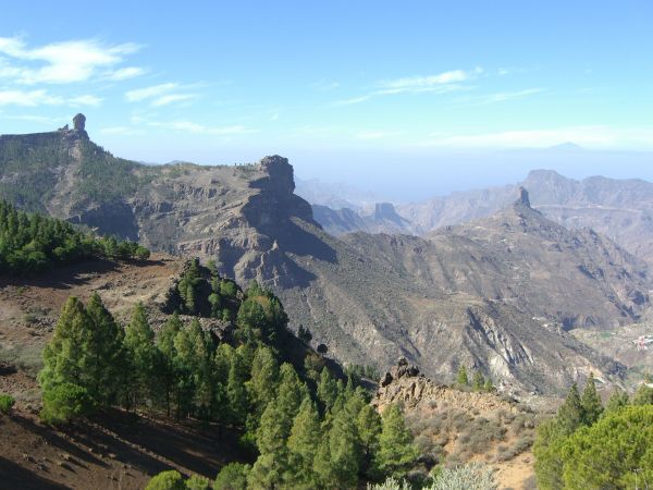 I was hoping to post about our vacation today, but the post has been taking more time and space than expected (as they usually do) so it won’t be done until tomorrow at the earliest. However I can say that we went walking in Gran Canaria, and post this picture at least. The rock perched on top of the ridge at the left is Roque Nublo (“Cloudy Rock”), one of the best known landmarks in Gran Canaria.