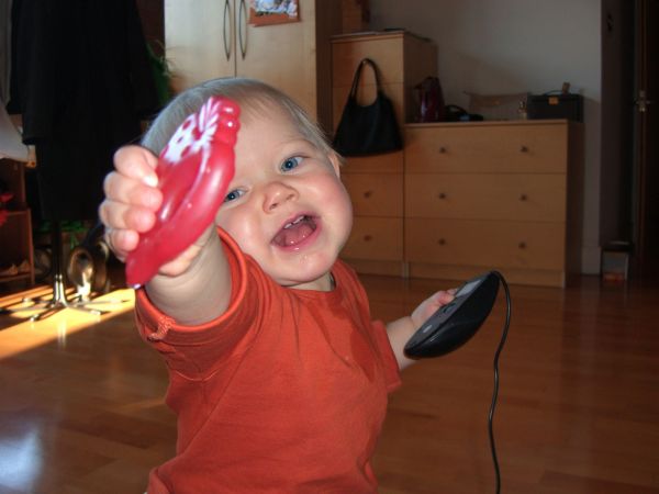 Toys are still mostly boring. If she plays with anything, it’s my gloves and hats. She can get a hand into a glove, and almost a hat on her head. But she is much more interested in picture books. The bigger the book, the better, is the general rule, although she also likes Muuu, säger kon and even a story book – Max bil. She can now turn the pages in those herself even though they are paper and not cardboard, although a few accidents have happened and the Max book has required some major repairs.