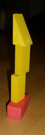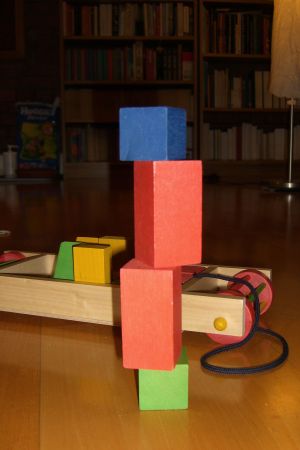 Case in point: building towers. When I build towers for Ingrid to knock down, they tend to be more or less straight, which lends them a certain stability but also predictability. When Ingrid builds a tower, she always stacks the blocks on their narrow ends and picks the tallest blocks, and she places the blocks whichever way they happen to land, which means it takes her about 10 tries to build something that’s more than 2 blocks high. (She also hasn’t understood yet that it is impossible to place another block on top of those narrow wedge-shaped ones.) While my towers don’t fall down when you breathe in their direction, Ingrid’s look more interesting.