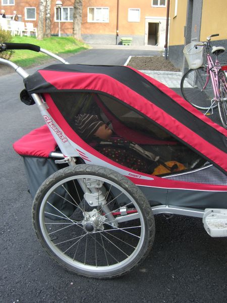 The picture shows Ingrid and the hat in our Chariot Cougar cycle trailer. It’s one of our best baby investments: expensive, but well worth the money. Well designed and well made, robust, easy to use, convenient and comfortable – great in every way.