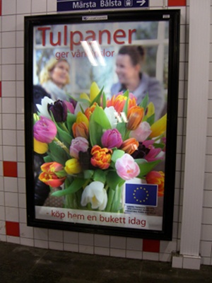 Here’s a poster I spotted the other day. (Sorry for the glare; I couldn’t get into better position because that would have entailed standing right in front of the exit from a busy escalator.) It reads roughly Tulips bring a feeling of spring – buy a bouquet today. And then in smaller type, Campaign financed with the support of the European Union and the International Flower Bulb Center.