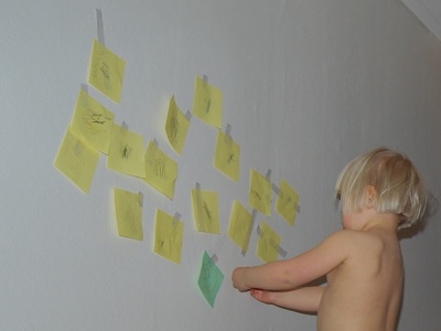 When she makes things at nursery, she insists on taking them home. So some days we’ve come home from nursery with a bunch rolled-up papers, each secured with seven or eight pieces of tape. She also likes taping notes on the wall. I’m glad she is not aware of the existence of post-it notes.