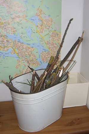 Once the snow is gone, we will find a good place for the sticks in some corner of the garden, so we can move the collection outdoors.