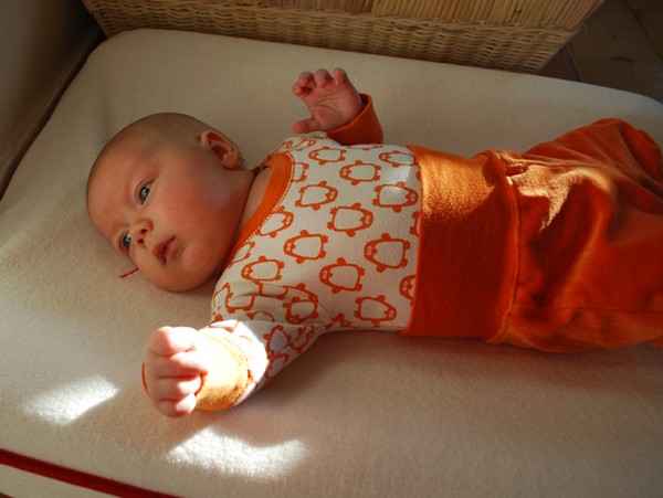 Unlike Ingrid he likes his dummy and wants to suck on it when going to sleep, no matter whether in bed or in sling. Also unlike Ingrid he does not like the pushchair or the pram. Both have been banished to the basement for the time being.