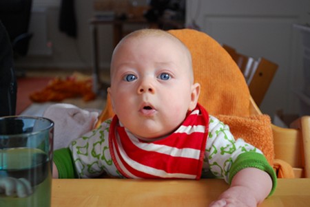 This baby definitely hasn’t read Gina Ford or Tracy Hogg (The Baby Whisperer). I started out with the usual sleep-eat-play rhythm, plus some extra feeds in the evening before bedtime. But nowadays he usually wants to eat more often than that, usually twice in each awake period. It took me a while to figure that out, but now I know that when he starts fussing about an hour and a half after waking, it’s probably more food he wants and not sleep.