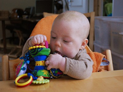 He can sit pretty well in the highchair as long as we stuff a few rolled-up towels at his sides to keep him upright. This way we can have him with us at the breakfast table, with a heap of toys in front of him.
