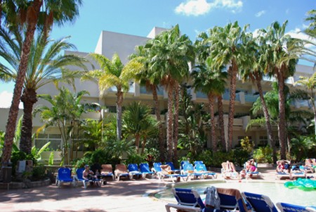 Tabaiba Princess, the hotel we’re staying at, is large and really nice, inside and outside. It’s almost a resort rather than just a hotel, with lots of palm trees and several large pools and even an artificial beach. The only thing it lacks is wifi in the rooms. There is a wifi hotspot in the lobby but even that costs money.