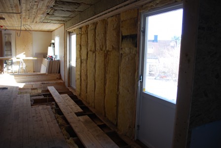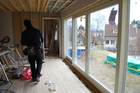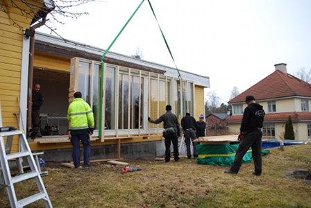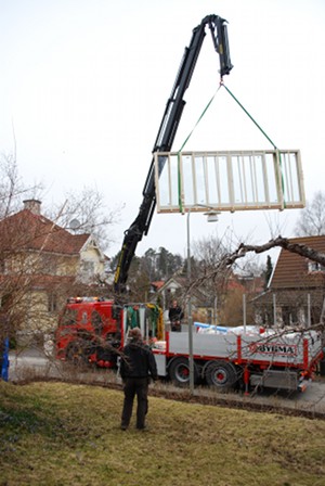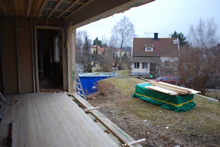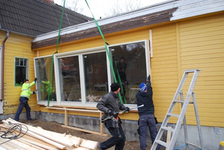 Around 8 o’clock the sliding glass doors arrived. They came on a flatbed truck with a huge crane: the whole section arrives in one piece, 5.3 metres long and weighing 680 kg. All this had to be lifted straight from the truck to where it’s going to sit – since it’s so big and heavy you can’t really move it without a crane. In our case this required a crane with a 17-metre reach, and 5 guys to get it in place. And because it was to be fitted into an existing wall they couldn’t just put it down, it had to be slotted into the wall from the side.