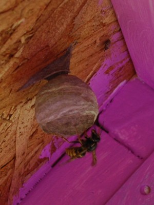 As I was painting Ingrid’s play house, I found the beginnings of a wasps’ nest inside. They’re fast builders: yesterday I saw one of them was flying around there, but no sign of a nest yet. Early this afternoon she had built slightly more than half of the first sphere. Now at ten o’clock when Eric took it down, that sphere was almost closed and she had started on the second layer. It was a beautiful, delicate construction. I wish I didn’t have to destroy it, but kids and wasps in a semi-enclosed room make a really bad combination.