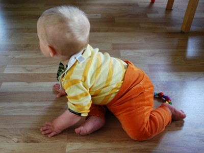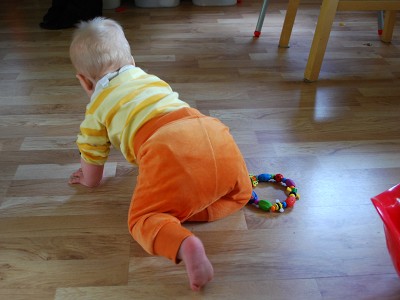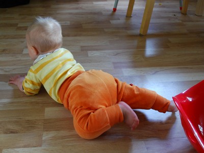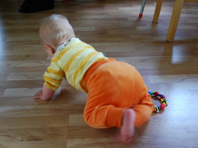 The interesting question is, why does he do it? How does he know that this is a productive position that can lead to something useful? He certainly isn’t learning it from us, none of us crawls around on all fours. And he doesn’t have any other crawling babies to watch either. But it is obvious that he wants to be crawling.