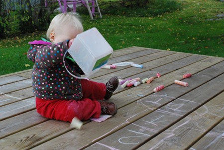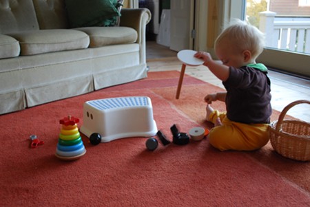 This is pretty much all that Adrian does with toys, too, so his favourite “toys” are things such as the chestnuts that Ingrid gathers, fridge magnets, and other smallish items that can be put inside things. For a while he also liked picking apart knob puzzles but I think that has lost its charm. He likes things with lids, too, such as the Lock N Lock food storage boxes we have everywhere in our kitchen, and the jar with beeswax salve I use. When he sees them with the lid off he grabs for the jar or box and tries to put the lid back on.