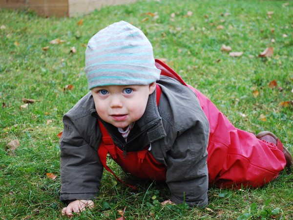 Quite unlike Ingrid, Adrian is apparently not hot-blooded. He willingly lets us dress him and co-operates when it’s time to put his arms in sleeves. He even likes putting on a coat, hat and mittens when going out, and will signal when he is cold by pulling his coat closer. On colder days we’ve started putting two layers on him at home, with a long-sleeved t-shirt over his body, and we’ve switched to a warmer blanket at night. He seems to like both of these. He is not very fond of socks, though, and pulls them off as soon as we put them on, so we don’t usually bother.