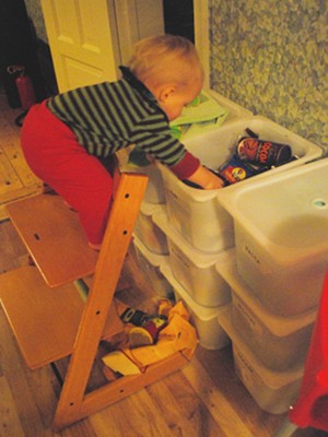 This chair trick means that he can now reach all the kitchen counters as well as the top boxes of our “pantry”, so all these need to be kept mostly clear of dangerous or fragile things. Kitchen knives have to be dried and put away rather than left on the drying rack; no open containers of e.g. flour or sugar or cooking oil can be left on the kitchen counters while preparing food. In the pantry we’ve simply moved the boxes around so that the ones he can reach are safe (for both him and the food inside): the topmost boxes now contain baking goods, root vegetables, and nuts and seeds, rather than opened boxes with pasta.