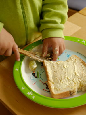 He sometimes works on cutting his own food, but generally prefers to either let us do it, or just eat with his hands. Also he is learning to spread margarine on bread. And everything else – such as grapes: