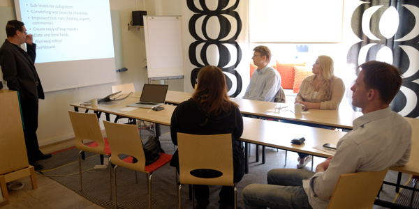 He talks a lot. Two-word phrases come all the time, and sometimes he does three-word phrases: emme titta hää for “mummy sit here” for example.