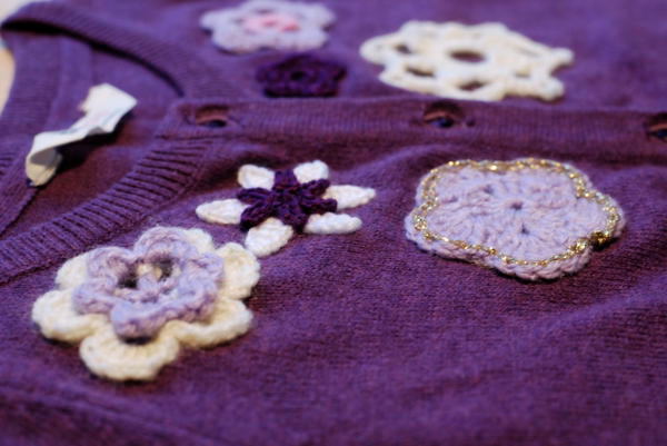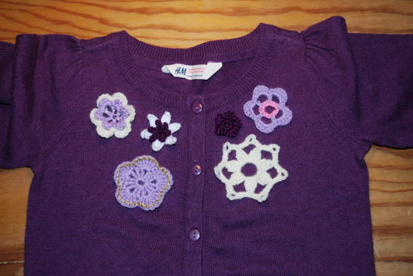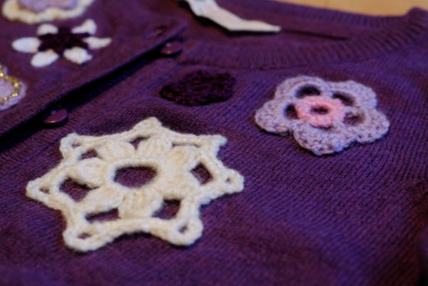 When I was browsing cardigan patterns for myself, Ingrid saw some photos of cardies with flowers around the neckline and asked if I could make one of those for her. Economizing, I bought a simple cardigan from H&M and just made the flowers myself.
