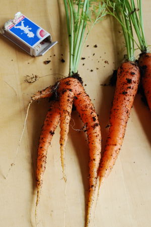 Today I pulled up our first carrots. They turned out to be totally ready for eating, and delicious to boot. (Even though some were mutant four-legged carrots.)