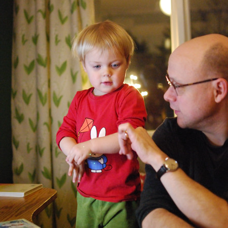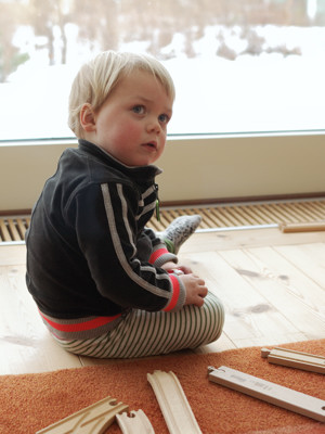 Every afternoon, after nursery but before we pick up Ingrid from school, we go grocery shopping. Adrian wants to hold the most important grocieries in his arms both in the supermarket and afterwards on the way home. And just like with the cars, he has difficulty understanding and/or accepting that he only has two hands. He holds a banana, a pair of mittens and a book in his hands, and hugs a large bag of corn snacks, and then asks for the juice bottle as well.