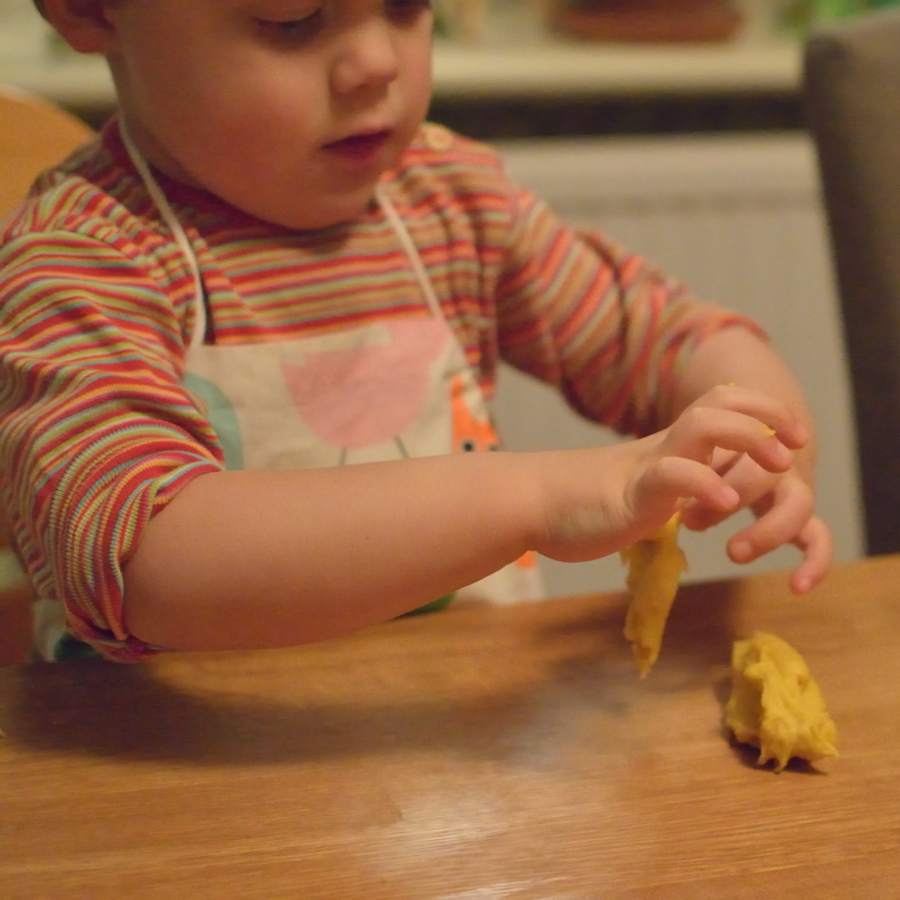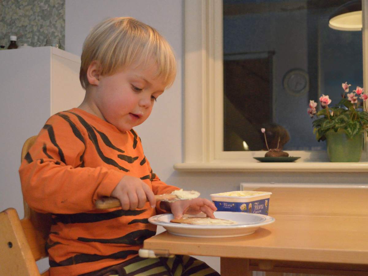 He is learning to butter his own sandwiches. When he eats a piece of bread he often wants to leave the crust and only eat the soft bits.