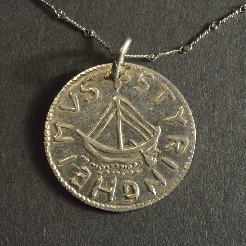 This was the first necklace I bought for myself. It is a silver pendant, designed to look like a Viking coin (but not a real one). The size of my thumbnail and paper-thin, and on an almost-invisible chain: an economical purchase for a teenager. But I still like it after all these years.