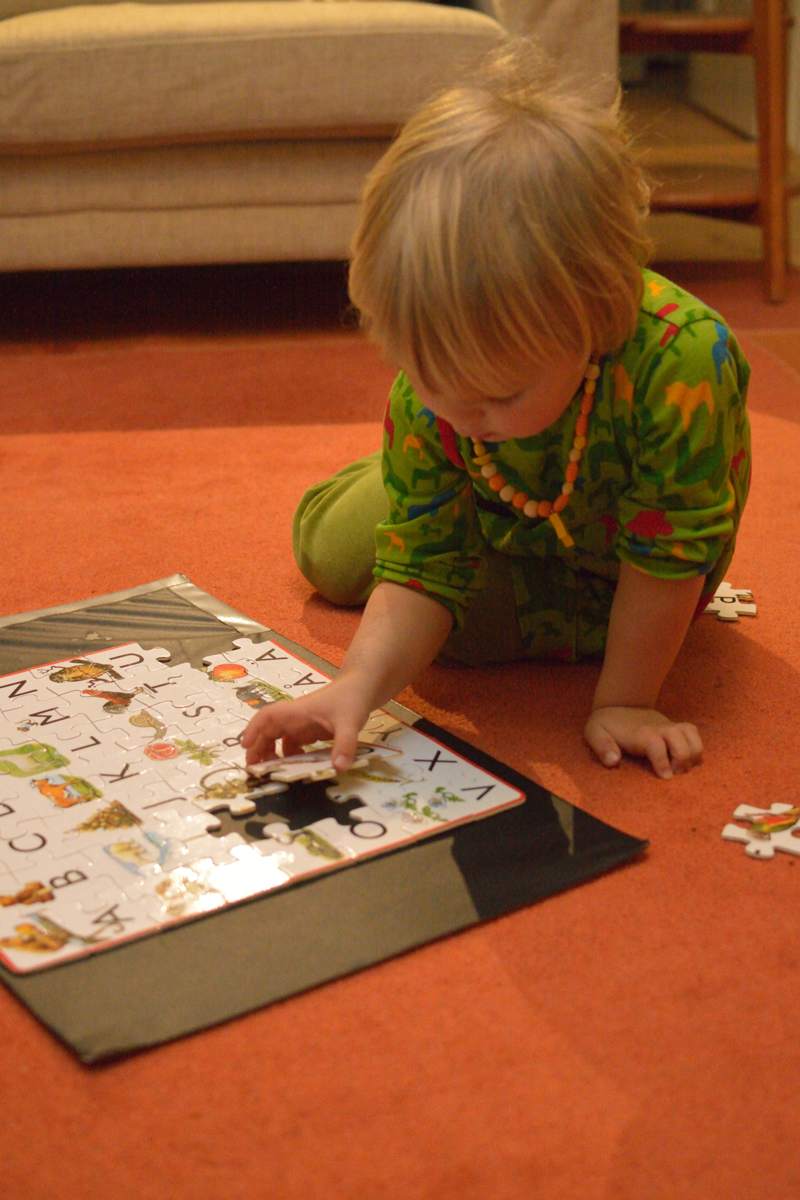 He can pick out the first letter of a word. He likes the alphabet song, and he has really enjoyed our alphabet puzzle, with a picture for every letter.