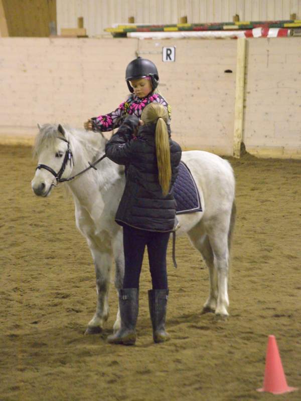 She feels reasonably confident when she’s sitting in the saddle, but on the ground she’s not yet very comfortable near horses. Well, they’re ponies, really, but still quite a lot larger than her. She’s afraid that she’ll be stepped on, or crushed against the wall when the pony steps sideways. Or bitten; there’s one pony there at the stables who seems to enjoy nipping people’s arms, or at least threatening to.