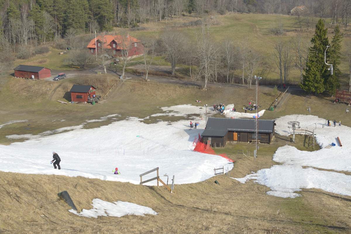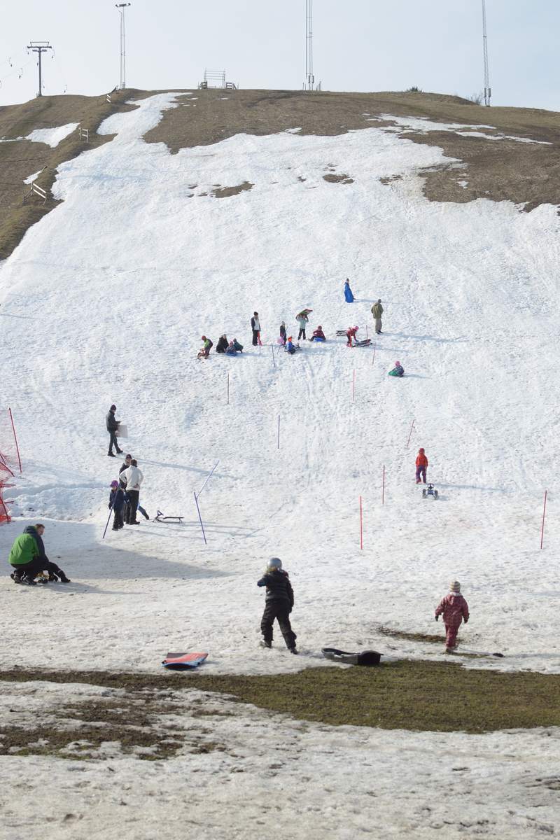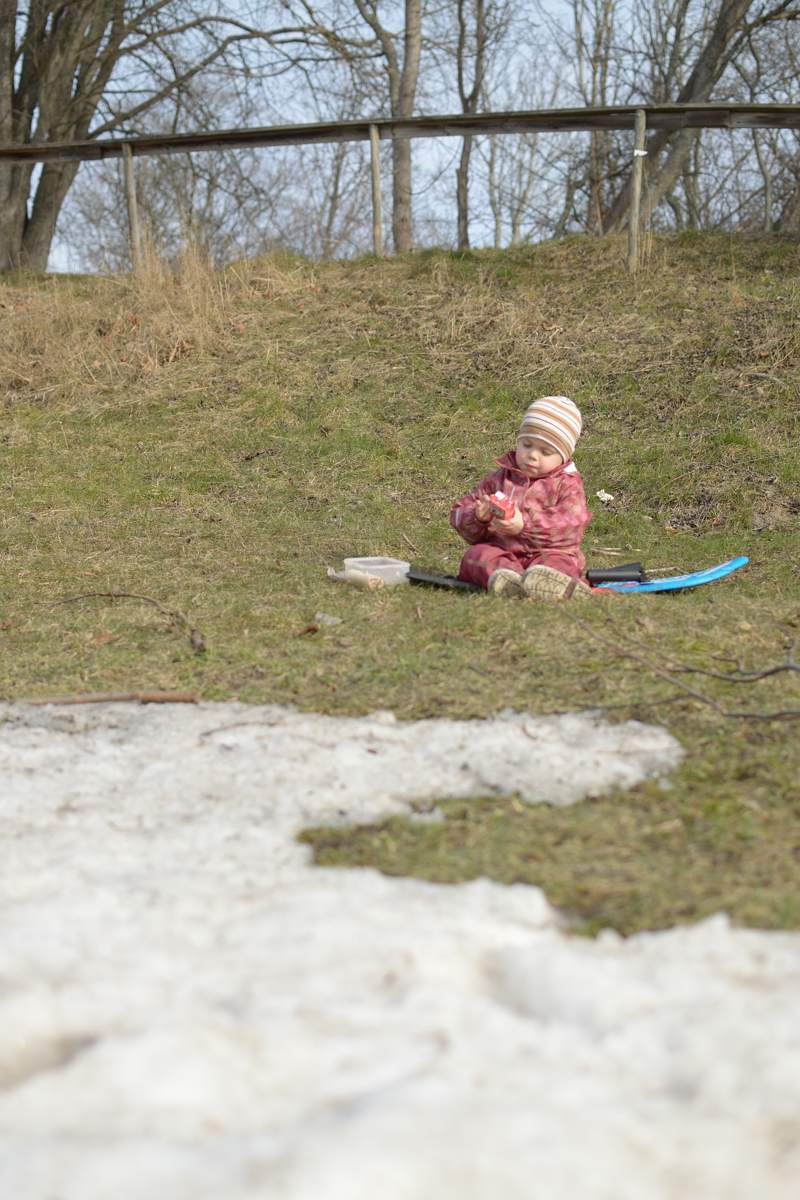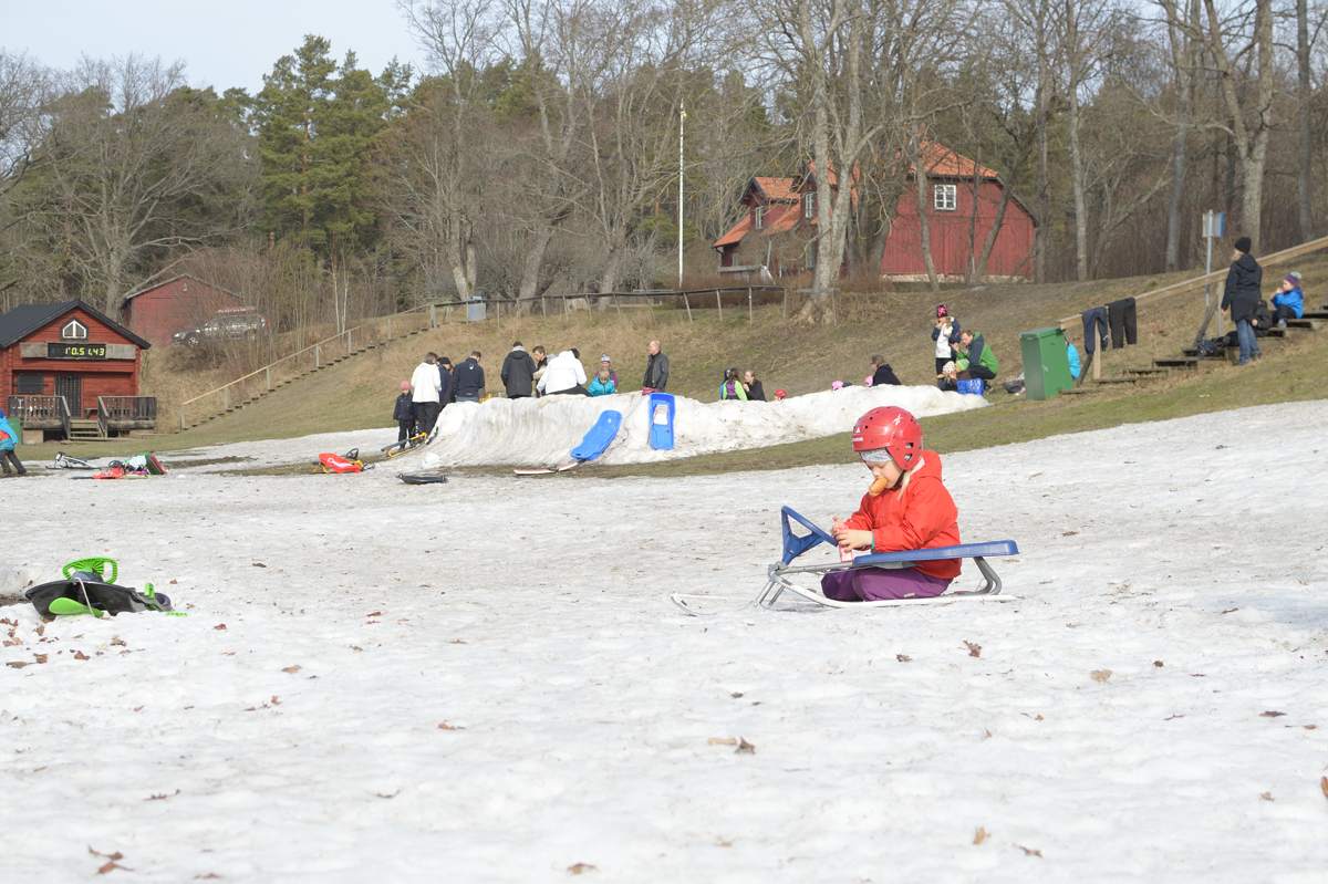 Making the most of the season’s last remaining crumbs of snow, we went sledding today at a ski slope nearby, together with Ingrid’s classmates. Some actual sledding took place but also just general hanging around, eating grilled hot dogs, and a trek up and down the slope. It felt quite weird to be sledding dressed in rubber boots and rain pants, but those were absolutely necessary because the snow was rather wet.
