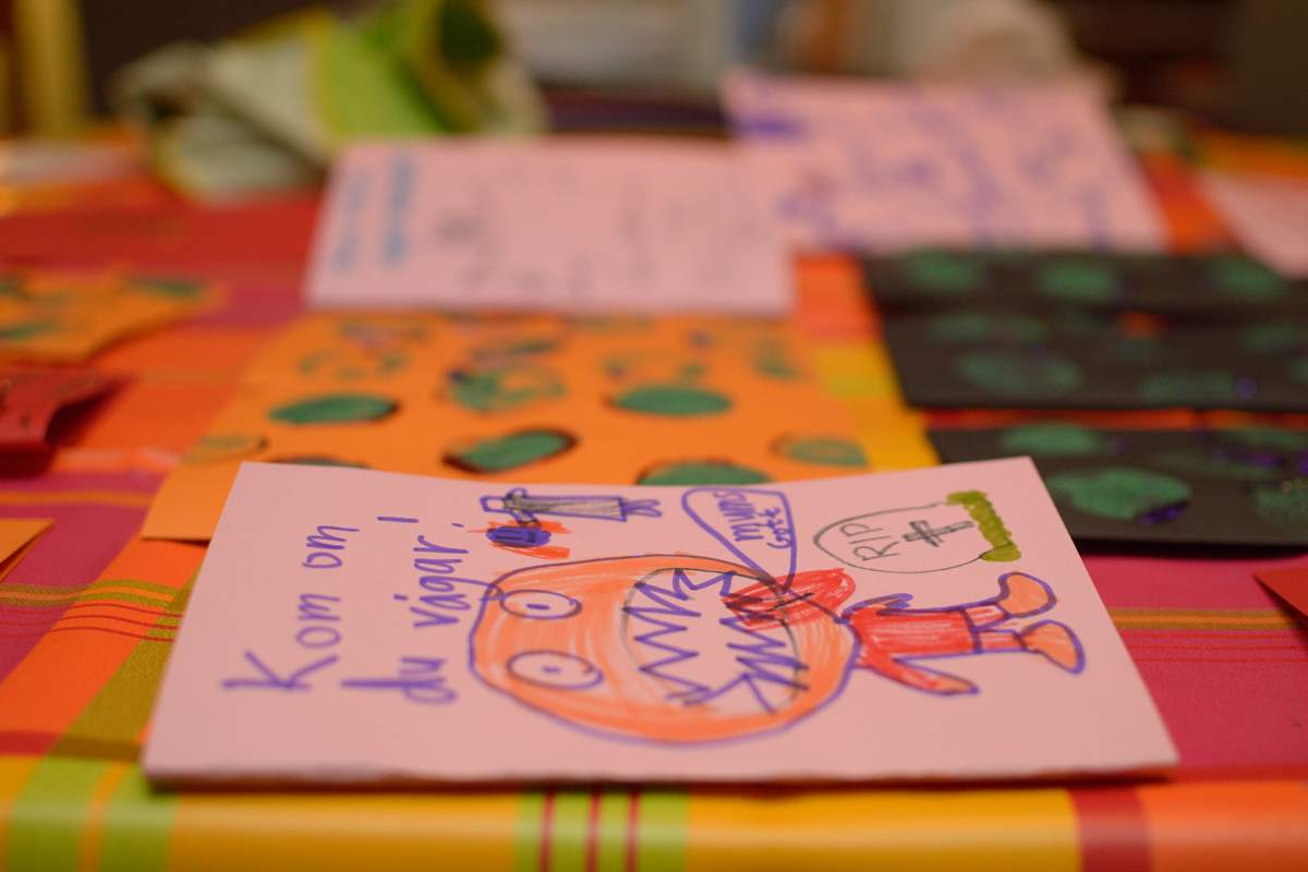 We crafted invitation cards for Ingrid’s upcoming Halloween-themed birthday party. Ingrid drew monsters and skeletons and gravestones on hers. My designs were more abstract.