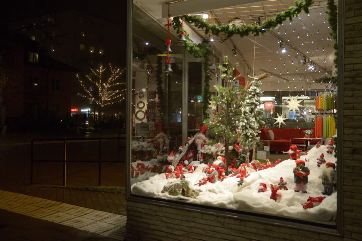 The local shops have put up their Christmas-themed window decorations and trees in SpÄnga torg have acquired lights.