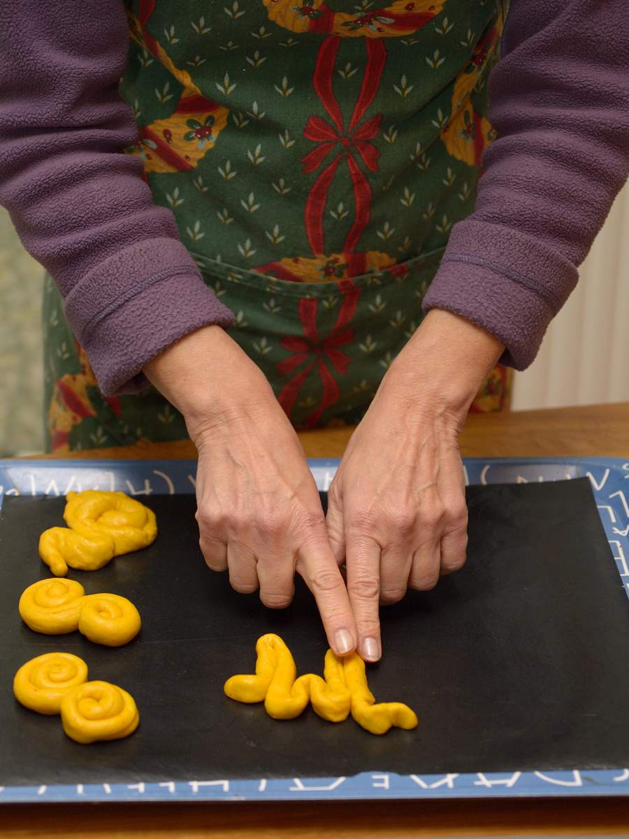 We baked lussebullar, saffron buns, today. We ended up with a wild mixture of all kinds of buns, including traditional shapes as well as “a pancake” by Adrian, several plaits by Ingrid, a few animals, and other things. My mum, especially, gets bored with the traditional shapes pretty fast and makes all kinds of weird squiggles.