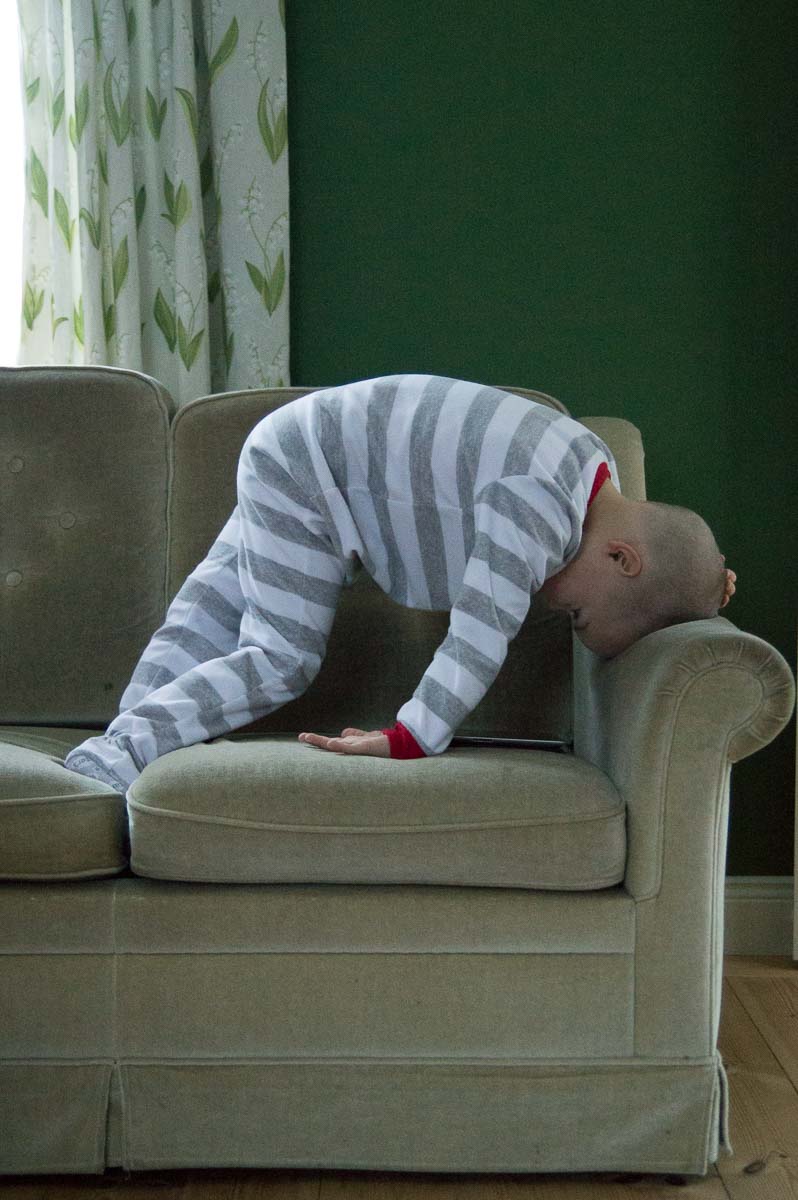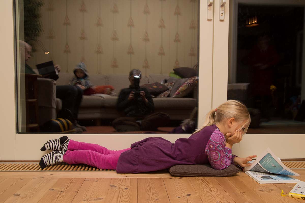Adrian, on the kitchen table, browsing Bamse.