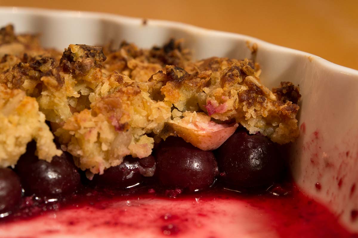 My favourite crumble (which really is a scrunch rather than a crumble) is still as awesome as ever. Here with cherries.