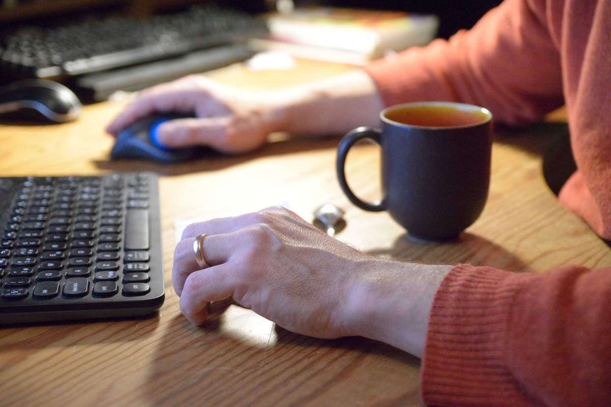 Eric with a cup of glögg in front of the computer, late at night when the kids are in bed.