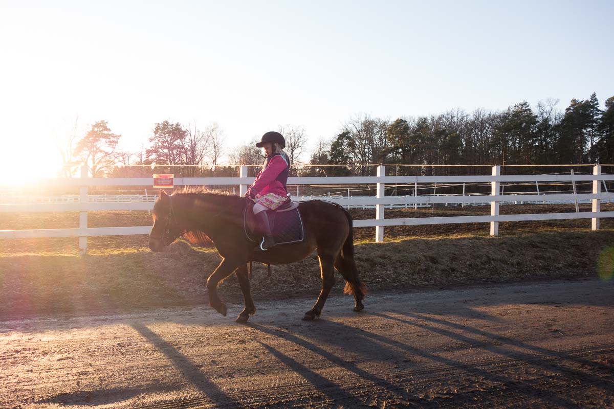 Spring is here. The ground is neither icy nor soggy any more, and the evenings are light. For the first time this year, today’s riding lesson took place outside, in the woods. The riding school is situated right at the edge of a nature reserve so we all had a nice walk in the woods. Ingrid was tired already when I picked her up at school, so an undemanding walk was just the right thing for today.