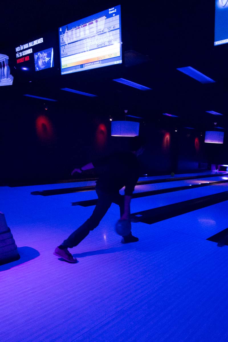 This was adult bowling, with drinks (optionally) and darkness (not optionally). Well, just a bit of blue light. The only bright thing was the screen showing our scores.