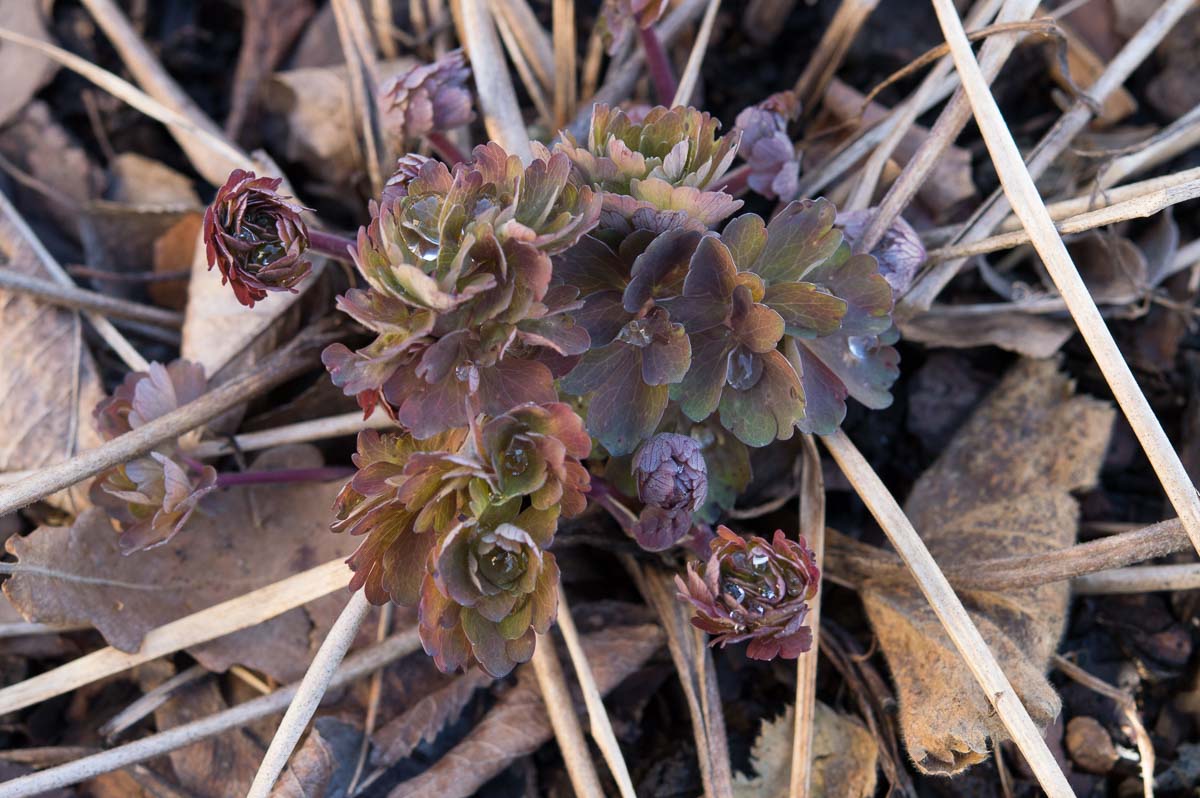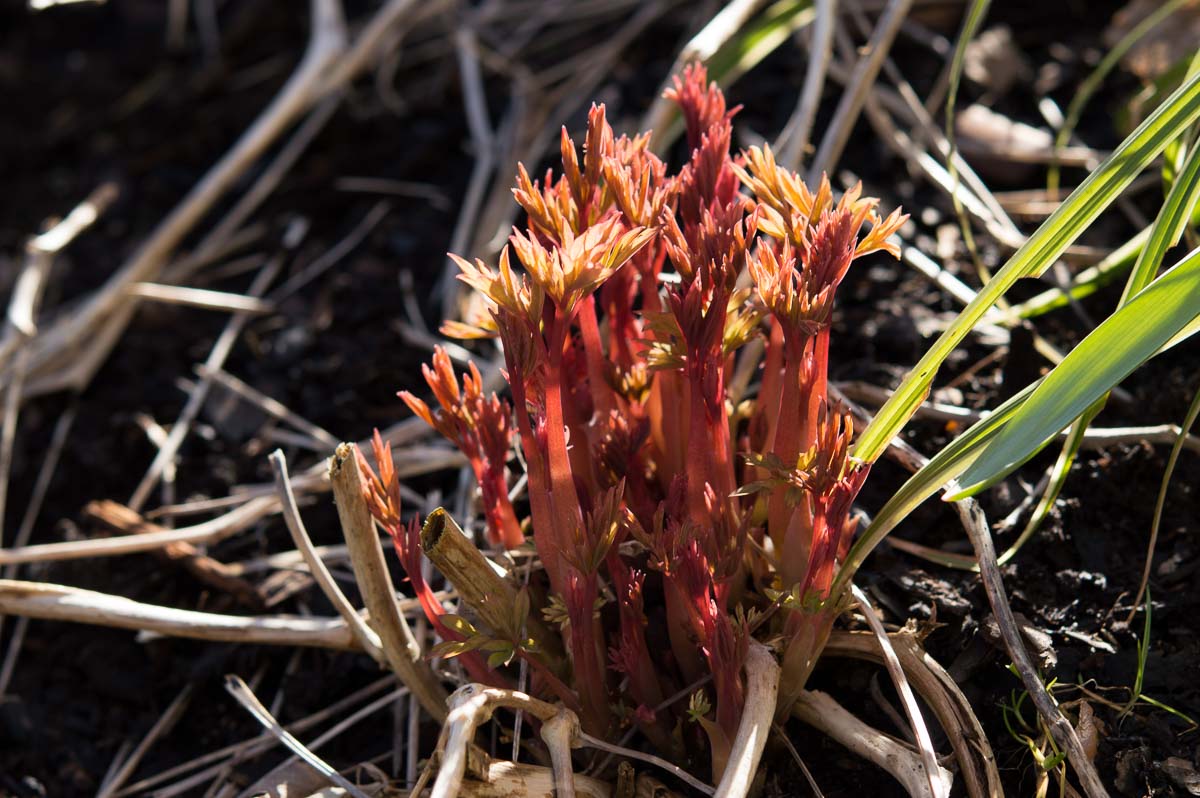 The perennials I planted last summer in the slope between the garage and the root cellar have woken and started growing, almost fast enough so you can see it.