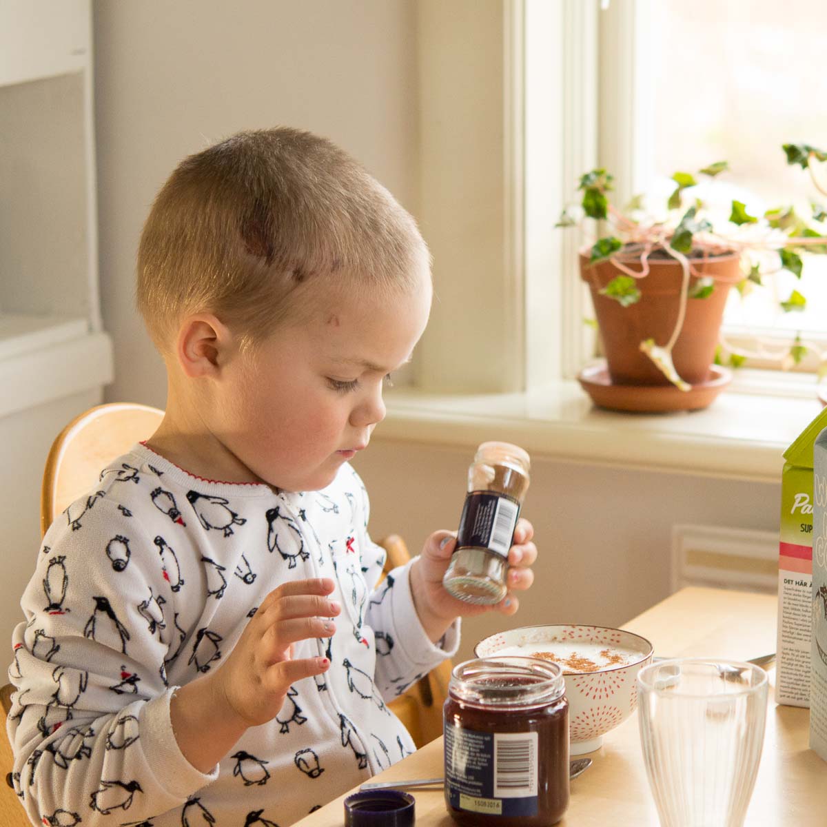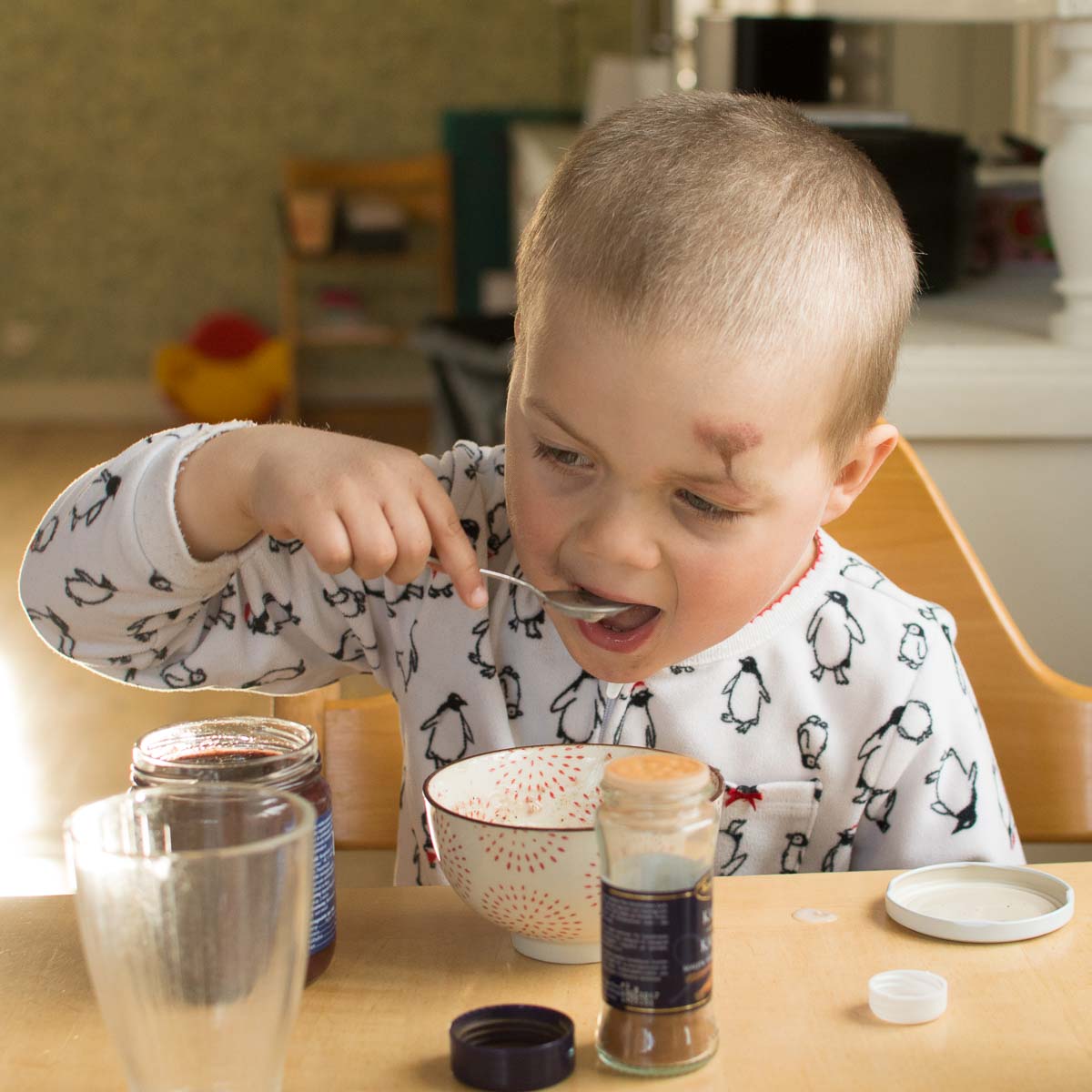 Adrian had a bad fall at preschool yesterday, hitting his head on asphalt in two places. Massive swelling on the side of his head and lots of skin scraped off, and a painful bump above one eyebrow. I washed the big wound and he had totally had enough after that, so I didn’t get to do anything about the dried blood on bump on his brow.